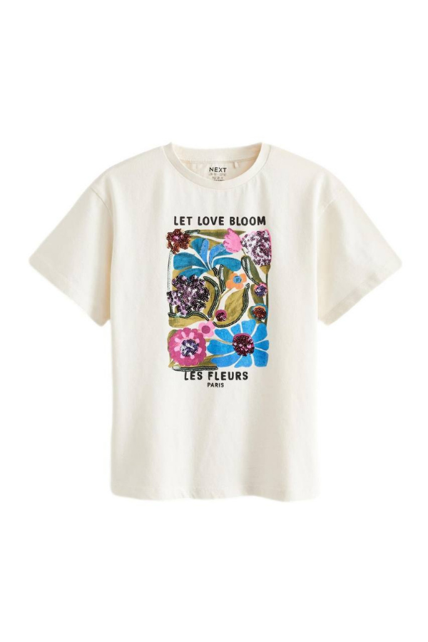 Kız Çocuk Pul İşlemeli Tişört Ekru